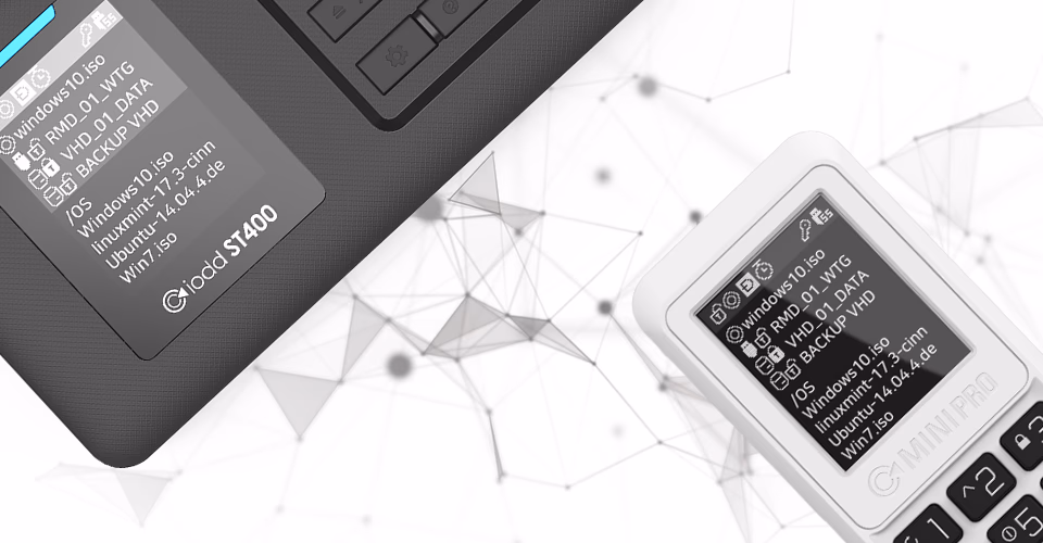 IODD는 하드웨어 기반 가상 광학 드라이브 및 가상 하드 드라이브 장치입니다. 내부 드라이브에 저장된 ISO, VHD 및 기타 지원 이미지 파일을 마운트하여 컴퓨터에 실제 물리적 드라이브(DVD-ROM 또는 HDD/SSD)처럼 인식시킬 수 있습니다. 에뮬레이션이 전적으로 하드웨어에 의해 처리되므로, 별도의 드라이버 없이 컴퓨터가 즉시 장치를 인식합니다.