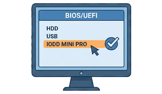 대상 PC를 재시작하고 BIOS/UEFI 메뉴에서 IODD를 부팅 장치로 선택하세요. 하드웨어 수준에서 에뮬레이션되므로 물리적 ODD 또는 HDD로 인식되어 완벽하게 부팅됩니다.