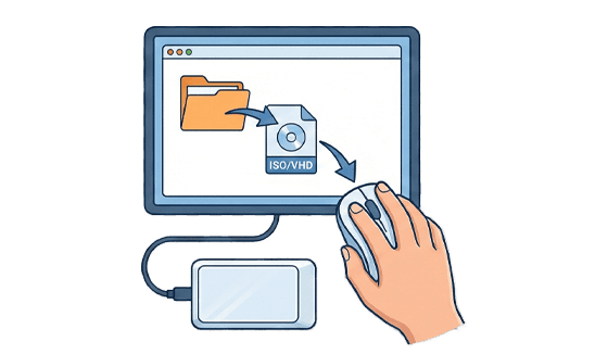 IODD MINI PRO를 PC에 연결하고 ISO, VHD 또는 DSK 파일을 드라이브 어디에나 복사하세요. /ISO 같은 특정 폴더 구조가 필요 없습니다—그냥 드래그 앤 드롭하세요.