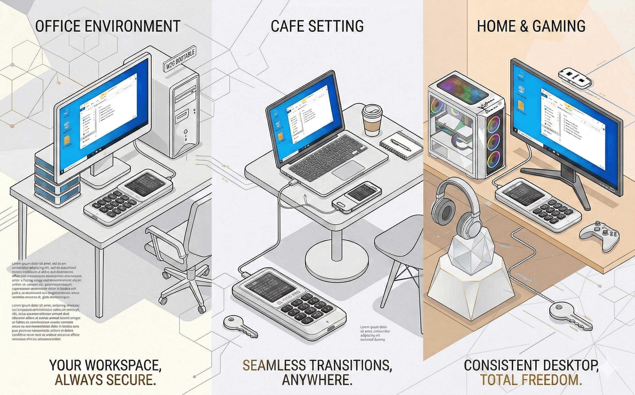 출장 중이든, 카페에서든, 공용 회의실 PC를 사용하든, 익숙한 데스크톱 환경을 즐기세요. 필수 소프트웨어와 맞춤 설정을 즉시 실행하며, 설치가 전혀 필요하지 않습니다.